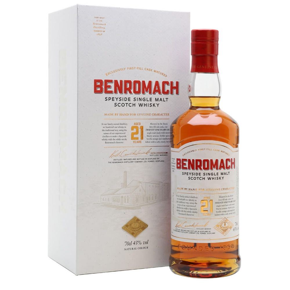 Ventuno anni di invecchiamento per questo Benromach invecchiato in botti di primo utilizzo ex-sherry ed ex-bourbon, una vera delizia.
